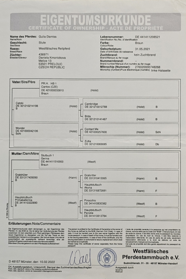 Gulia Damiss je mladá Westfalská klisna, narozená 31.5.2021 z matky Gerina/Gralshuter po otci Cantos/Catoki. Jako tříletá byla zapuštěná hřebcem Diamant Damiss Kinský a ve čtyřech letech porodila krásnou klisničku jménem Desire Damiss. Jelikož klisnička je velice pěkná, bylo toto spojení zopakováno a v letošním roce očekáváme narození dalšího potomka.