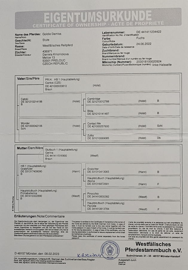 Goldie Damiss je Westfalská klisna narozená 24.6.2022 z matky Gerina/Gralshuter po otci Cantos/Catoki . Goldi je mladá, temperamentní s velice dobrou mechanikou pohybu, zlehka specifická až úsměvná. V tuto chvíli ve fázi obsedání.