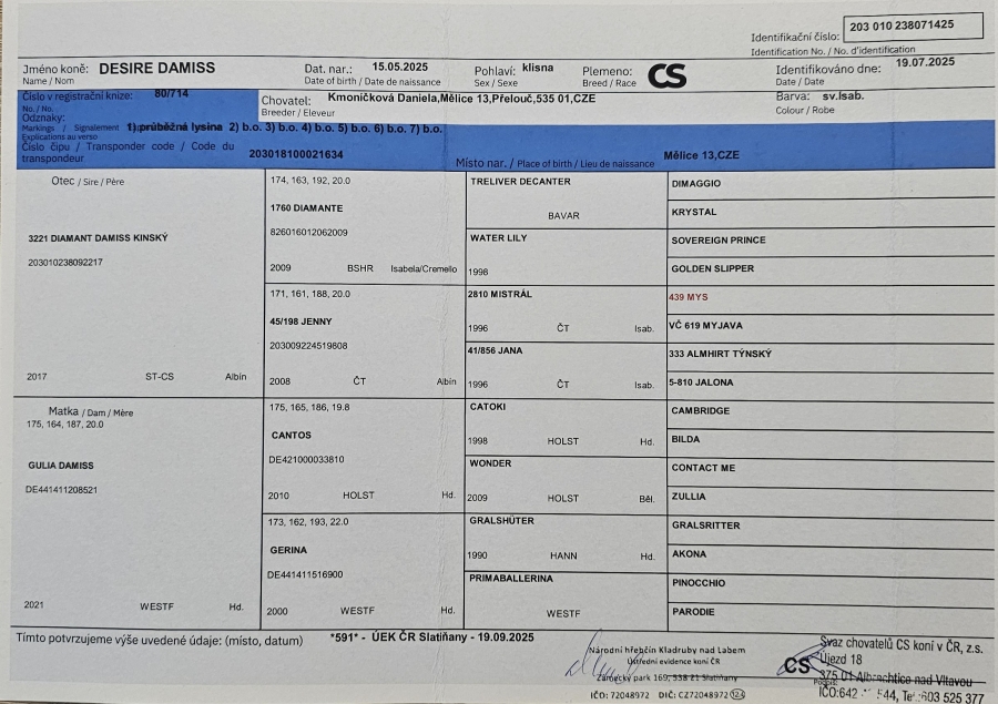 Desire Damiss se narodila 15.5. 2025 matce Gulia Damiss/Cantos po otci Diamant Damiss Kinský/ Diamante. Toto hříbátko je pro nás velmi výjimečné, první potomek z naší klisny a našeho hřebce . Je naprosto úžasná a máme z ní velikou radost.